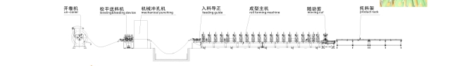 上料平臺—開卷機(jī)—伺服送料—沖孔沖壓—輥壓成型—切斷—翻轉(zhuǎn)送料